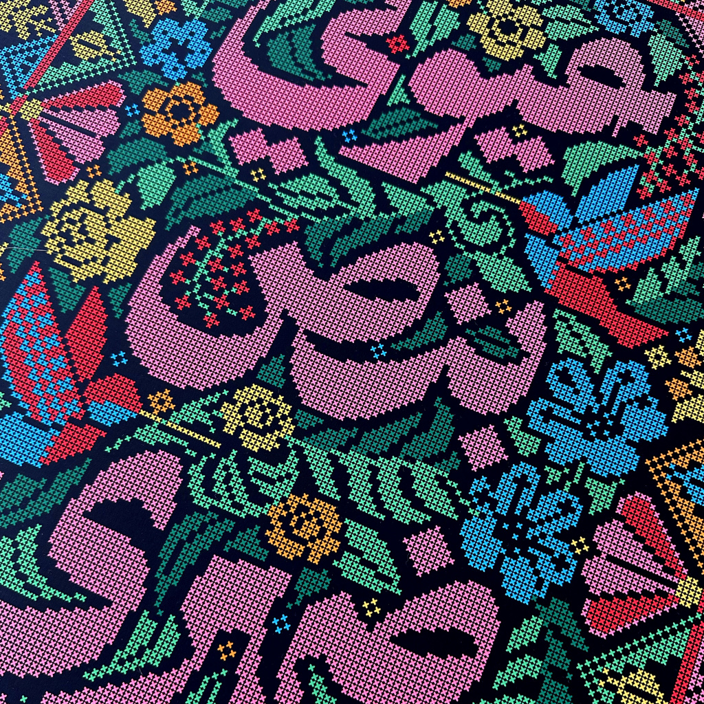 Inspired by the song where the sentence originates, the aim of the piece is to translate the grounded power and connection of women across generations. Stylistically, It is meant as a tribute to the Palestinian cross-stitching patterns and technique, a painstaking craft prominent among Palestinian women.